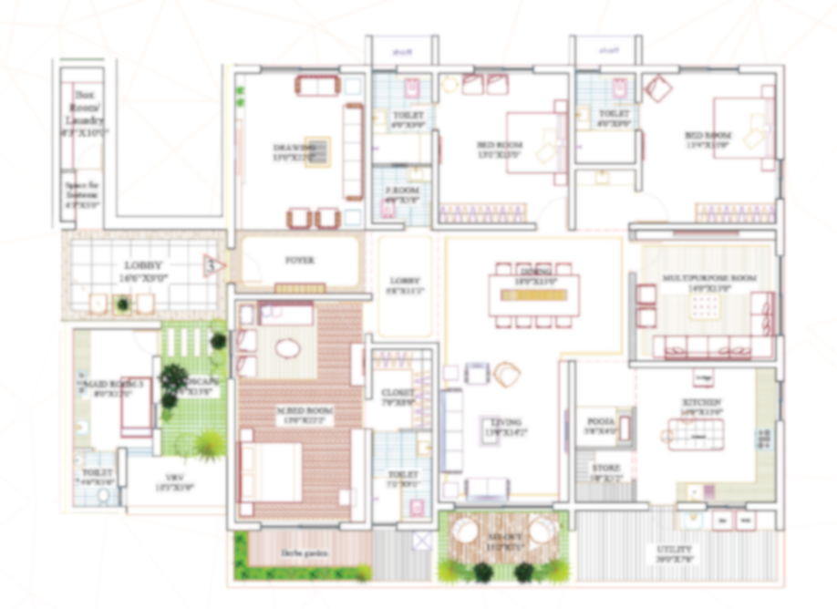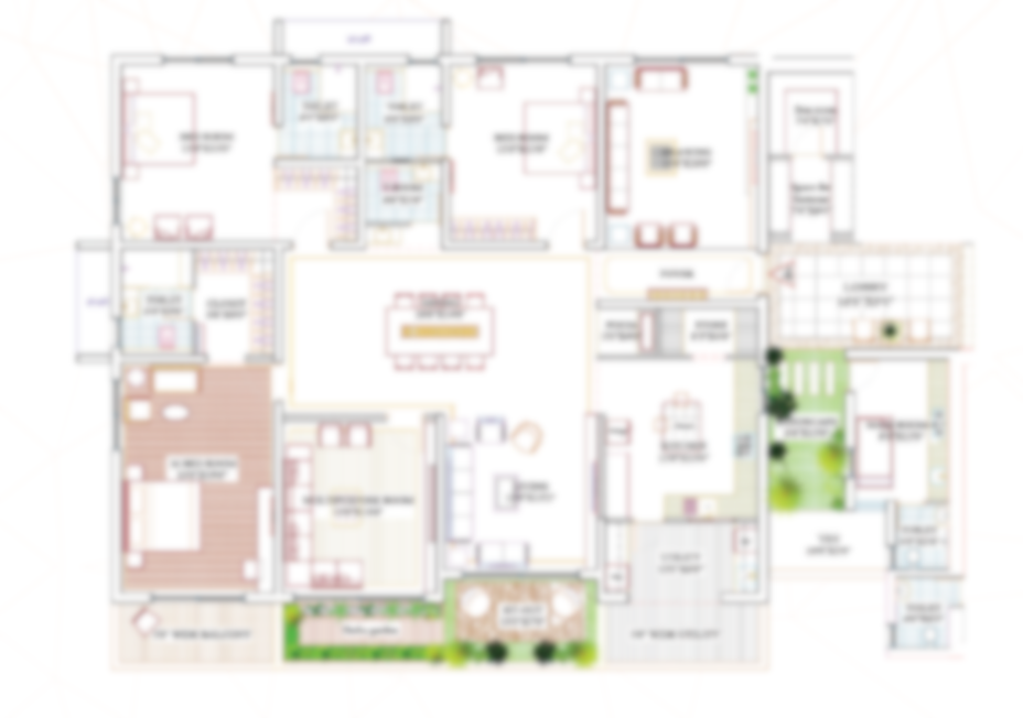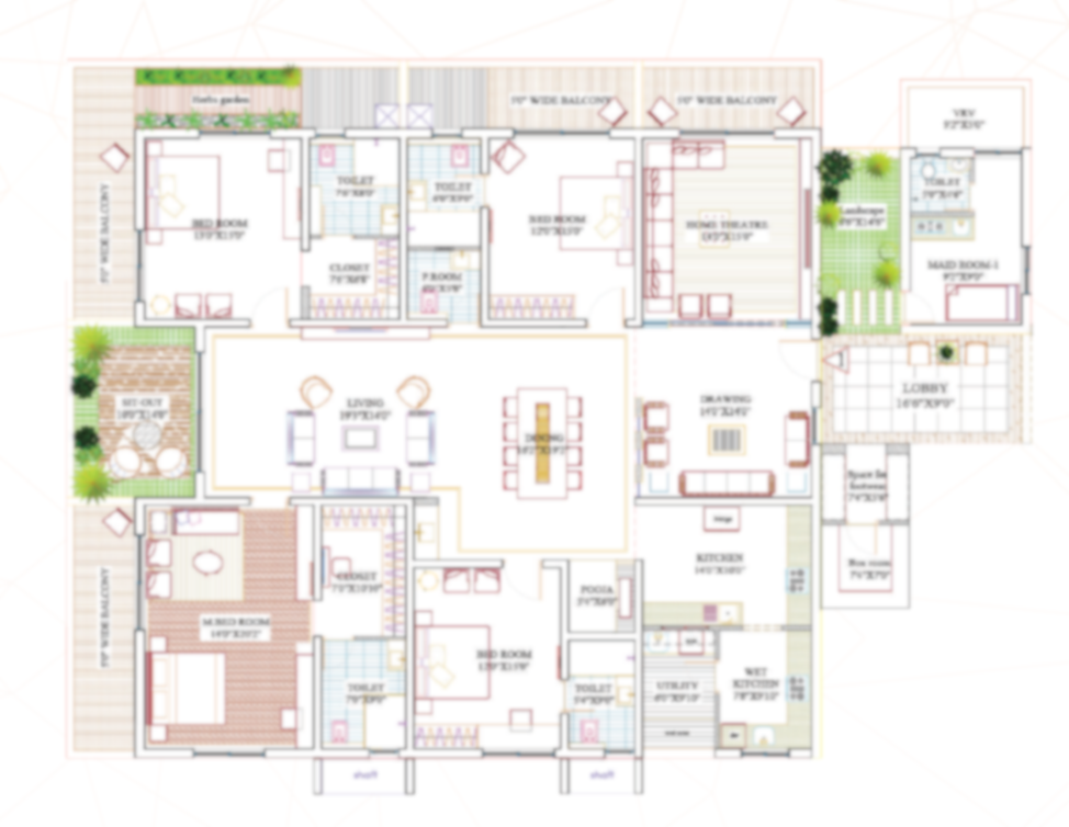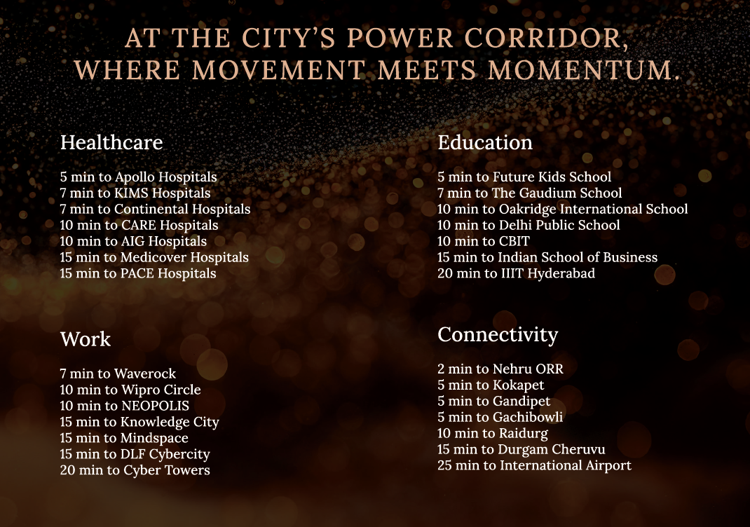 Encanto stands among the tallest residential towers in West Hyderabad, offering large-format 3 & 4 BHK homes ranging from 4,055 to 5,045 sq. ft. with a special multi-purpose room for hobby/home office/kids play/home theatre, etc. Every home is thoughtfully designed with vaastu-compliant east and west facing layouts, 5 ft. – 11 ft. wrap around balconies, private entry foyers with landscape deck, outdoor maid and box rooms. Skybridges at the stilt-mezzanine level and rooftop interconnect the towers, while five layers of landscape design in podium, stilt, clubhouse, terrace and individual flats, ensure greenery flows through every level and corner of the community. With direct basement access, essential and unique amenities, convenience is built in. The highest rooftop amenities in the city, including a jogging track, infinity pool, terrace coworking, and entertainment areas, complete the picture of elevated living.